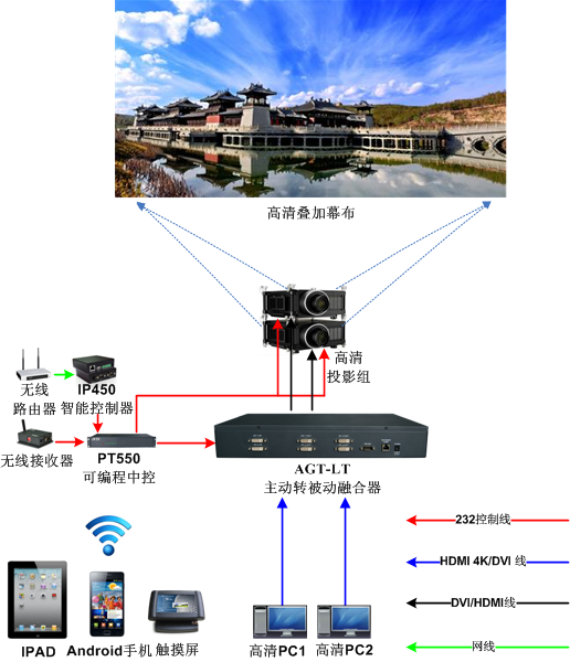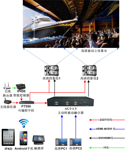 - 支持1*2或者1*1高清投影阵列实现高清立体演示效果