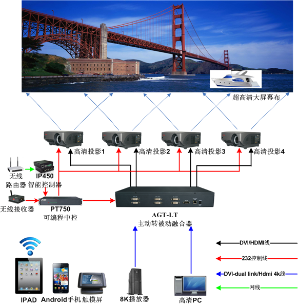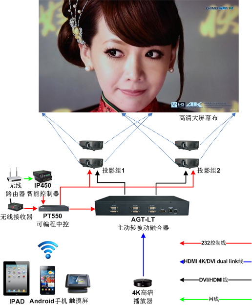 - 通过4台1920*1200高清投影上下融合,实现4K*2K分辨率超高清图像显示